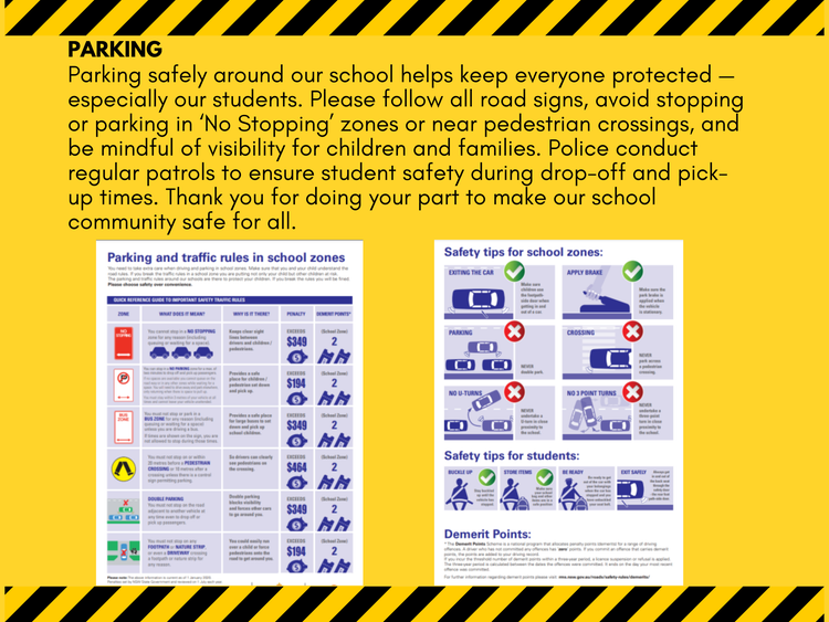The start and end of the school day are busy times for pedestrians and drivers outside schools. Parking safely around our school helps keep everyone protected — especially our students. Please follow all road signs, avoid stopping or parking in ‘No Stopping’ zones or near pedestrian crossings, and be mindful of visibility for children and families. Police conduct regular patrols to ensure student safety during drop-off and pick-up times. Thank you for doing your part to make our school community safe for all.